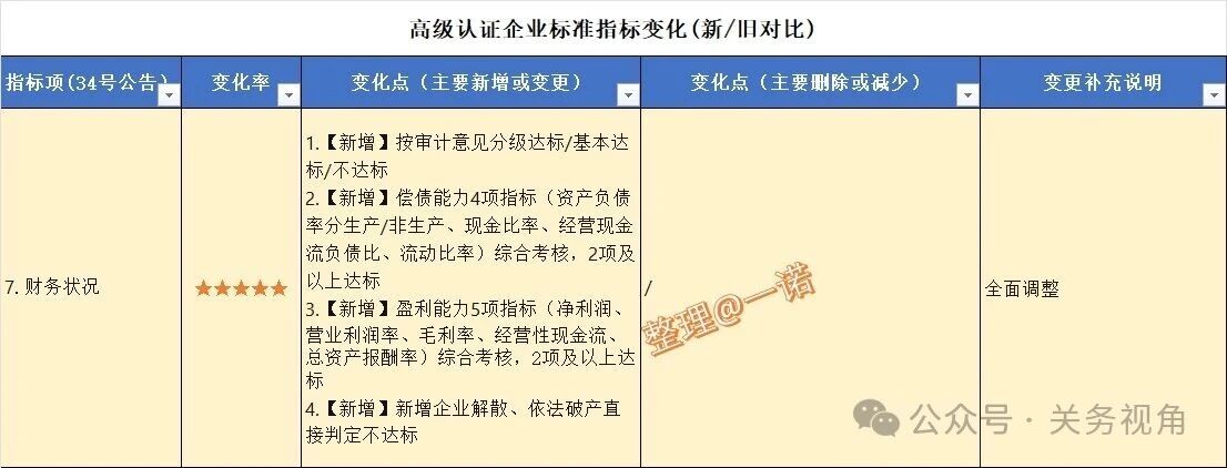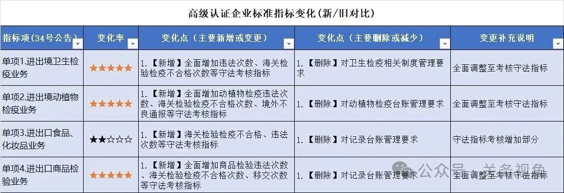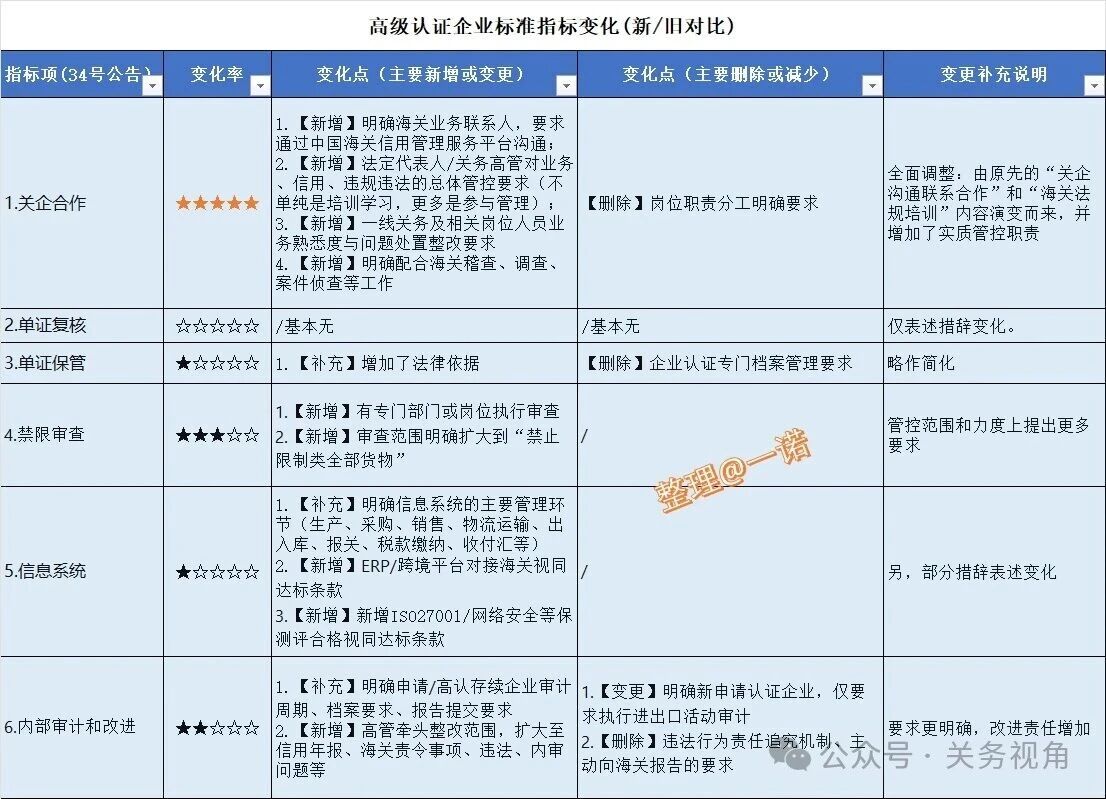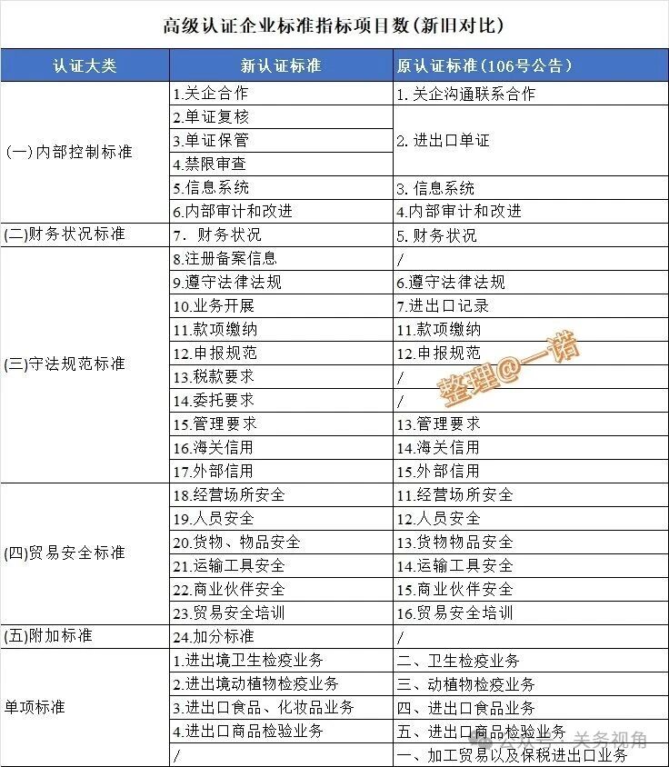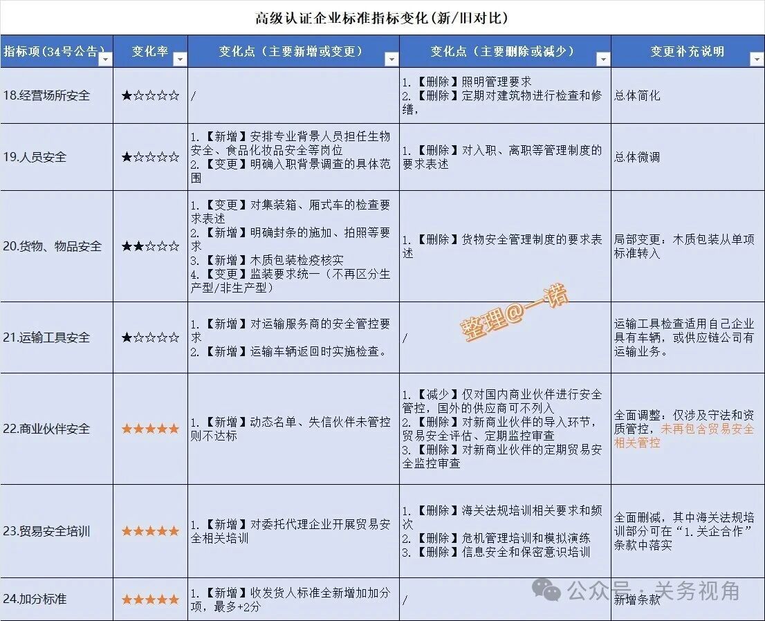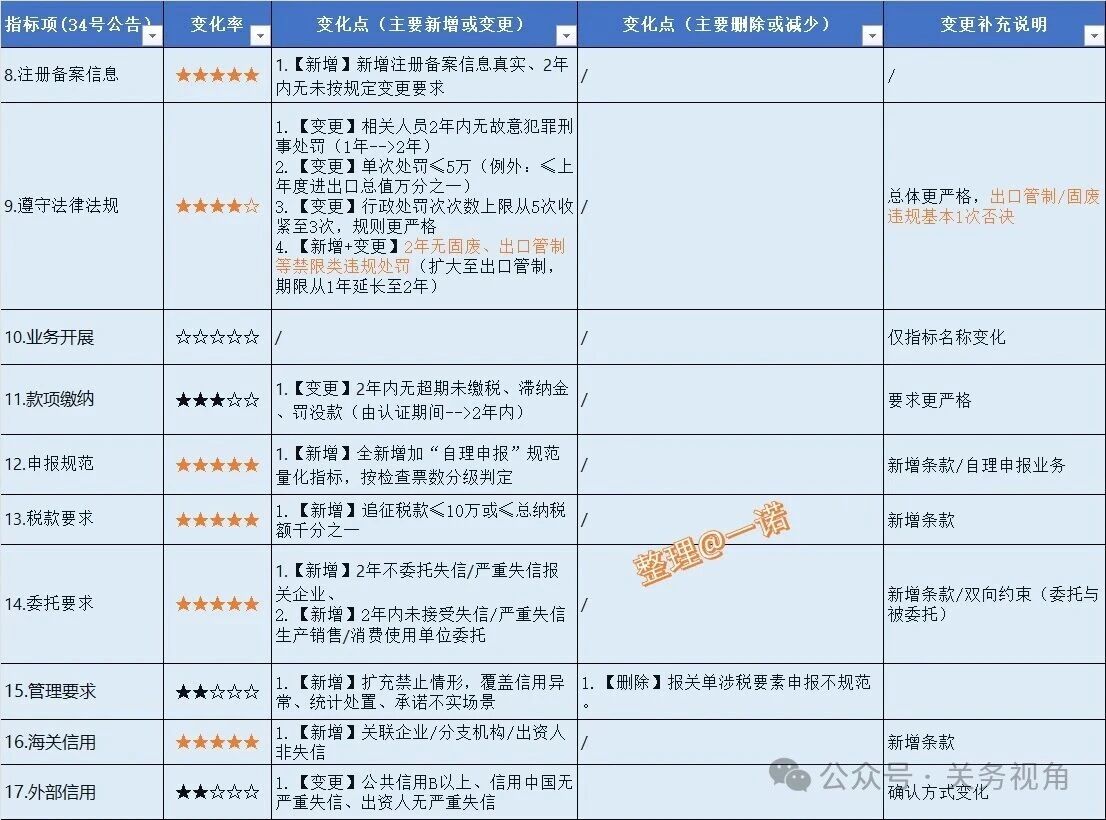 核心变化点是提升了守法规范的硬性指标要求,而去除了一些台账记录管理要求,另去除了“加工贸易以及保税进出口业务”单项指标。总体:硬性要求提高、软性管理简化。